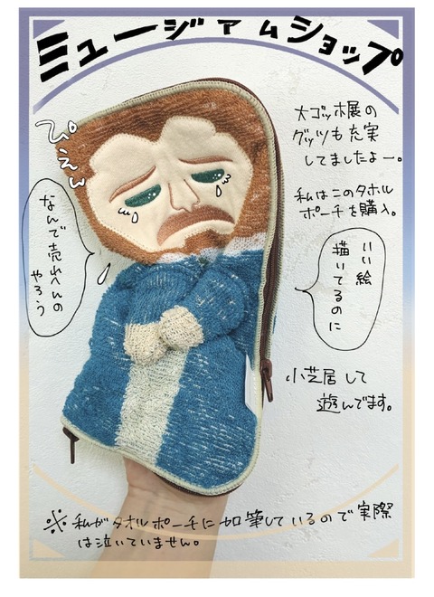 ゴッホさん…⊂((・x・))⊃ 2026年03月14日 美術館の楽しみと言えば、ミュージアムショップ!今回は入場制限もありました。転売ヤー防止🤔?ゴッホ風ミッフィー(高い)や定番のマグネットやポストカード傘やパーカーもありました。その中でも私が気に入ったのがこのタオルポーチ!(2300円位だった)学校でもこのパペット ... 続きを読む