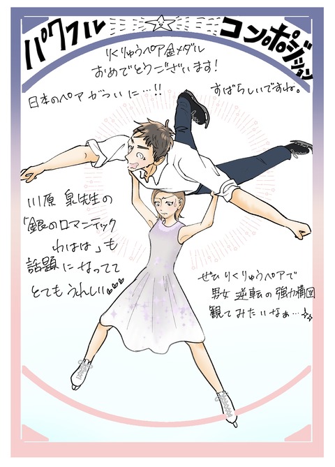 りくりゅうのパワフルコンポジションに期待 2026年02月22日 ついにフィギュアも終了して冬のオリンピックも終わりですね。やっぱり頑張ってる人っていうのはなんだか応援したくなるもんです。私が大好きな漫画家の川原泉先生もフィギュアスケートの漫画「銀のロマンティックわはは」という漫画を書いているんですが、最近りくりゅうペ ... 続きを読む
