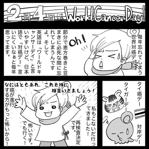 再検査のご報告 2021年02月21日 前回「世界対ガンデー」「world cancer day」について描いたんですけど、思いのほか海外の方からの反応もあって、英語バージョンを作ってみました。1ミリでも人の役にたつことが出来るならやってみようの精神です。めっちゃがんばって訳したけど、変なところがあったら教えて ... 続きを読む