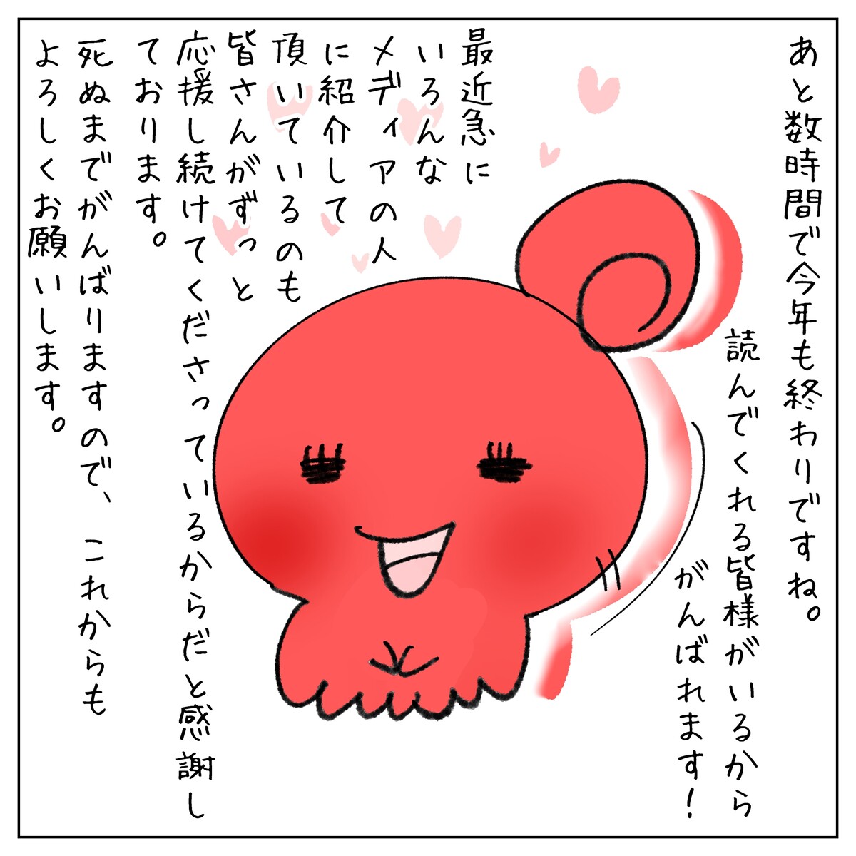 感謝を込めて 2021年12月31日 クリスマスからお正月にかけてこの時期は修行だと思って頑張っています。家族みんな楽しみにしてくれているので、止めるにやめれなくなってしまったおせち。こういう時だけ可愛くママのご飯がおいしいって言ってくれます。そして、「え⁉️そう(〃ω〃)」といって作ってしまう親バカな私。スンマセン🙇♀️「ママが壊れた⁉️」と阿鼻叫喚沢山の感謝を皆様へ。2022年皆様に良いことが沢山ありますように✨ 「お知らせ」カテゴリの最新記事 タグ :#大晦日 < 前の記事次の記事 > コメント コメント一覧 (8) 7. れーこ 2022年01月01日 01:06 あけましておめでとうございます。 おせち作りお疲れ様でした。 私は31日まで仕事でした😅ただいまと帰ると 「お帰りママ~。お煮しめ作っておいたよ😃」と娘。 天使だ!娘よ🌼 やよいかめさん、愛は必ず帰ってきますよ。 今年もよろしくお願いします。 0 やよい かめ がしました 8. やよいかめ 2022年01月01日 14:58 >>7 れーこさんへ お仕事お疲れ様でした🍀えらい❗️最高👏 娘さんも最高です🤩👏👏👏 子供たちに作ってもらえる日が来たら泣いちゃいますね😭✨ 私もぜひよろしくお願いします🐙🌈 0 やよい かめ がしました 3. K本 2021年12月31日 23:23 ずーっと読み続けていたいので、絶対に長生きして下さい! 0 やよい かめ がしました 6. やよいかめ 2022年01月01日 00:28 >>3 K本さんへ あけましておめでとうございます🥳 長生きがんばります🐙❗️ 命ある限り何かしら制作していこうと思っていますので、よろしくお願いします😆👍 0 やよい かめ がしました 2. ひめ 2021年12月31日 23:02 いつも楽しく読ませていただいてます😊 闘病記なのにどこか楽しげ、かわいいイラスト大好きです! やよいかめさんの2022年が良き年になりますようにお祈り申し上げます❣️ 0 やよい かめ がしました 5. やよいかめ 2022年01月01日 00:26 >>2 ひめさんへ あけましておめでとうございます🥳 いつも読んでいただいてありがとうございます✨ おそらく今年もアワアワ😰バタバタ😵しながらがんばって書いていくと思うのでよろしくお願いします🐙🌈 0 やよい かめ がしました 1. ママヴィン 2021年12月31日 23:00 やよいかめさん、こんばんは( ´ ▽ ` ) お疲れ様です✨ 期待されるとつい張り切っちゃいますよね笑 私はやっとさっき終わりました…(疲れました💦) あと少しで年が明けますね! ご家族皆様、良いお年をお迎えください♪ これからも楽しみにしてます。 0 やよい かめ がしました 4. やよいかめ 2022年01月01日 00:24 >>1 ママヴィンさんへ おせちお疲れ様です😆🍀 私は今から詰めます💦 年越しそばの用意をしている間に年が明けてしまいました。 あけましておめでとうございます🎍 昨年に引き続きぼやぼやすることも多々あると思いますが今年もよろしくお願いします🥳✨ 0 やよい かめ がしました コメントフォーム 名前 コメント 記事の評価 リセット リセット 顔 星 情報を記憶 コメントを投稿する
