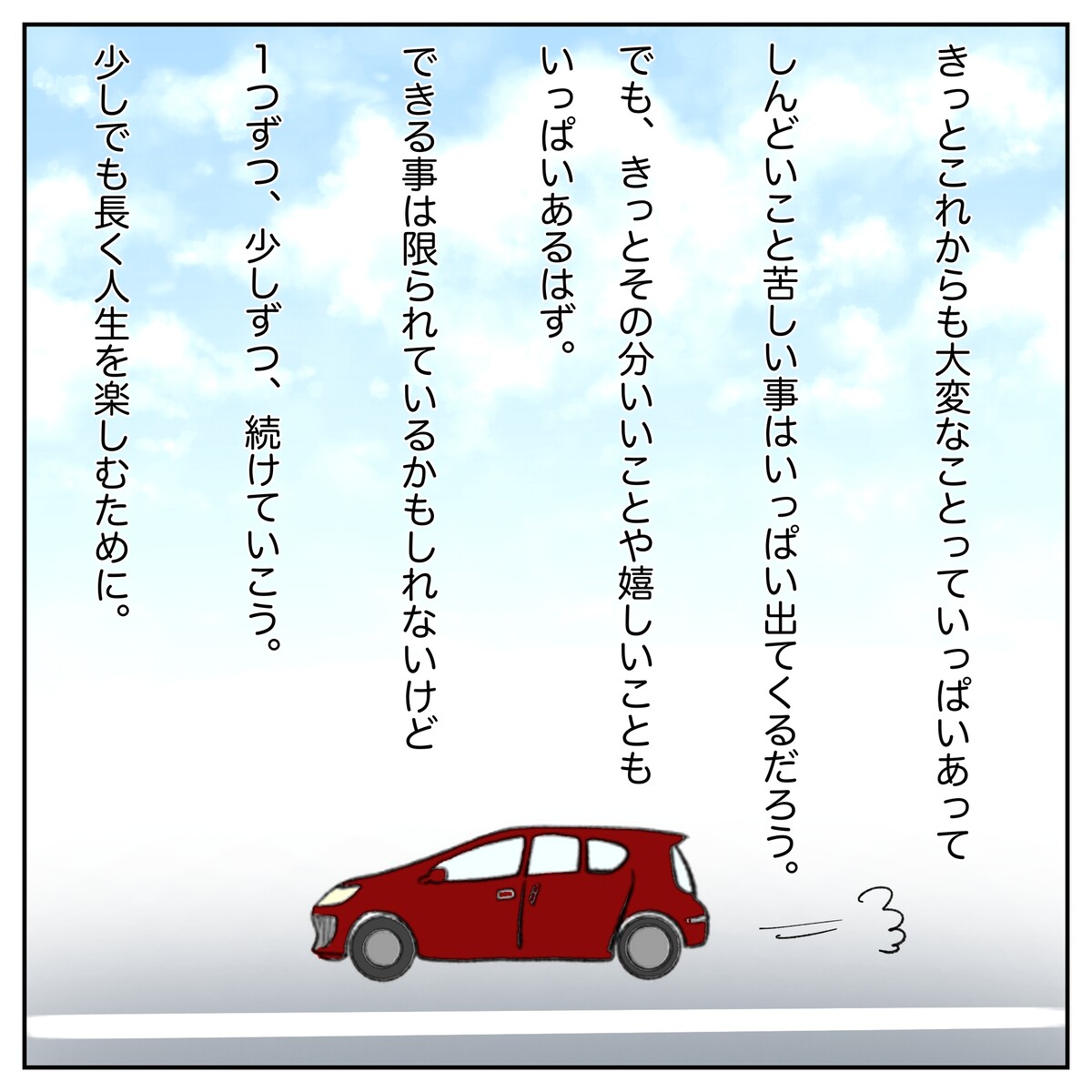 意義ある日々を送らなければって言うのもその通りとは思いますが、なによりも毎日を 無事に積み重ねて生きるってことがベース!ってやよいかめさんの漫画を読んで実感しました。
