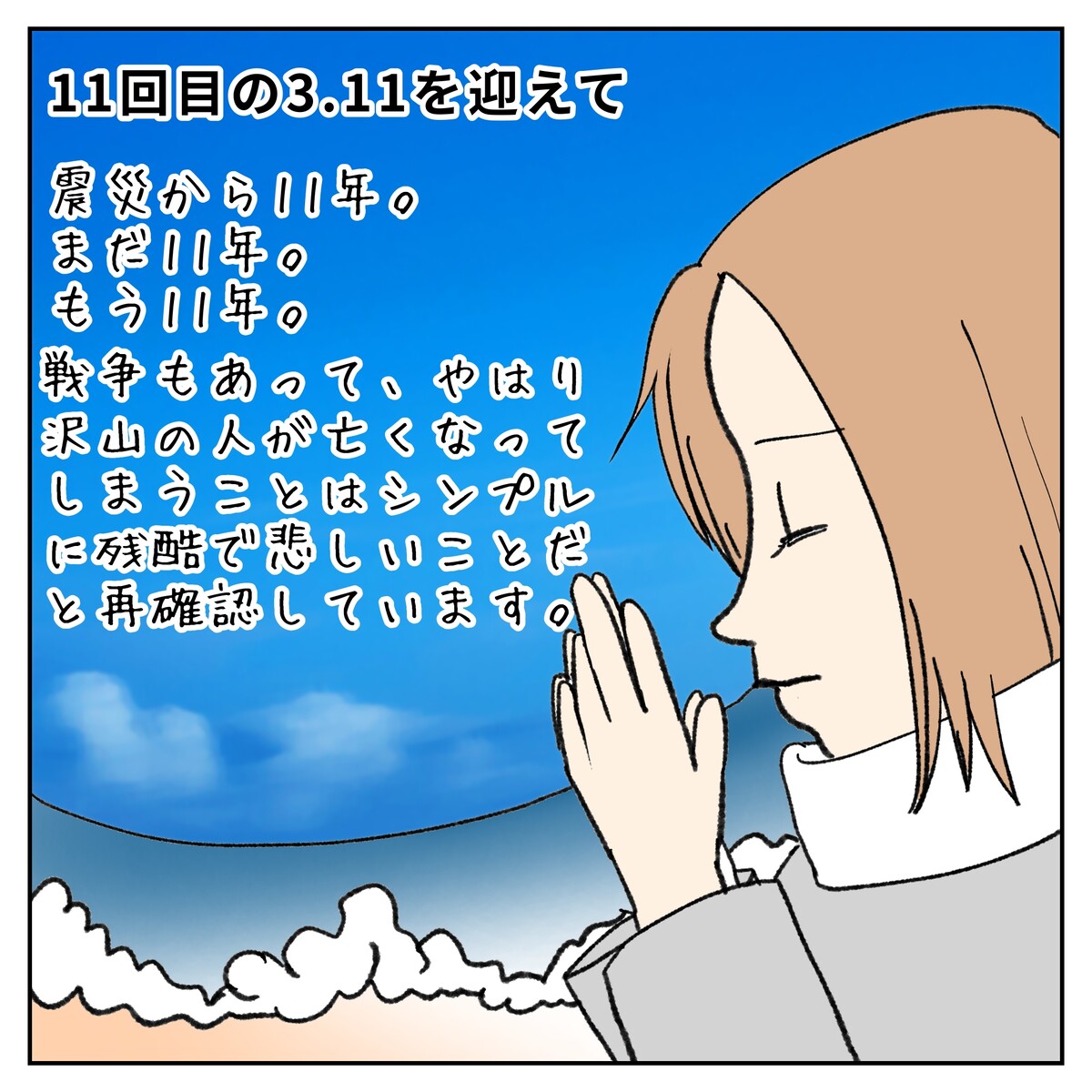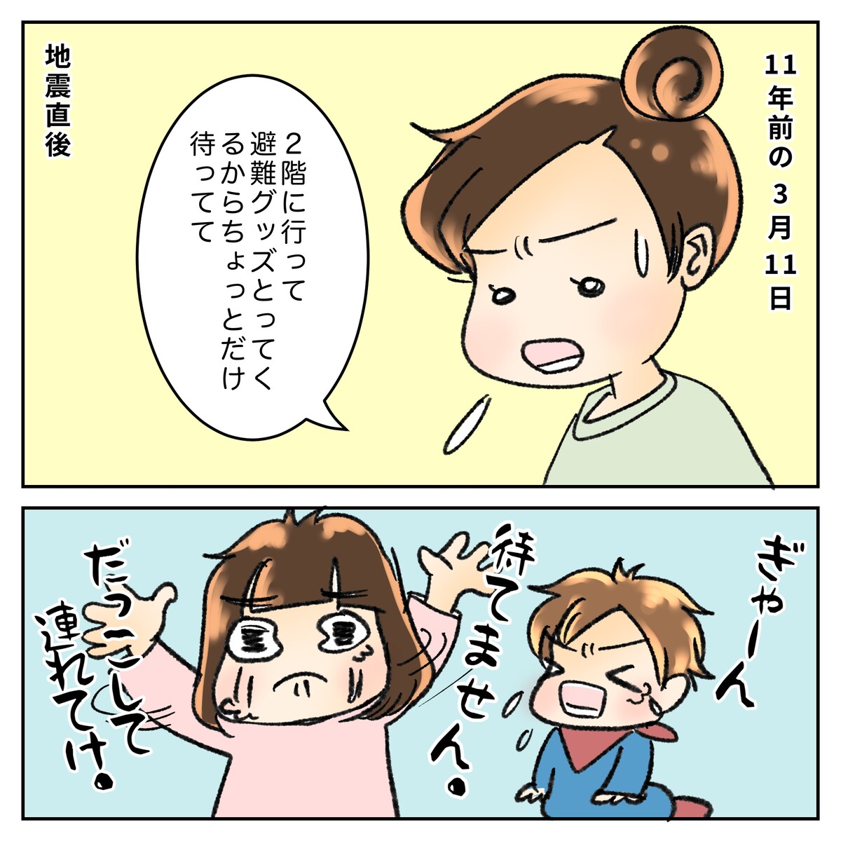 もう11年。まだ11年。 2022年03月11日 あの時はものすごく焦っていて、 子どもたちを抱えて2階まで荷物を取りに行った思い出です😭💦大人は私1人。乳飲み子を抱えてテンパリまくりでした。「なんとかせな!」という気持ちが子どもを持ち上げてしまいました😓でもよく考えたらすごく危ないので真似しないで下さいね。しないか( ̄▽ ̄;) ぜひ反面教師にしてもらえたら幸いです。 「日常漫画」カテゴリの最新記事 タグ :#東日本大震災#防災バック#漫画#コミックエッセイ#3·11 < 前の記事次の記事 > コメント コメント一覧 (2) 1. ななし 2022年03月12日 00:12 2階に行ってくるですね。1コマ目、ちょっと引っかかって止まってしまいました。後のコメントで理解出来ました。腰を壊されないで良かったです。 0 やよい かめ がしました 2. やよいかめ 2022年03月12日 09:05 >>1ななしさんへ 教えて下さってありがとうございます😊🍀 肝心な部分を盛大に間違ってしまいました😓 画像は差し替えておきました。 0 やよい かめ がしました コメントフォーム 名前 コメント 記事の評価 リセット リセット 顔 星 情報を記憶 コメントを投稿する