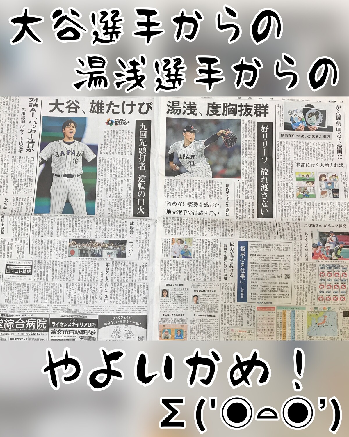 本日の福島民友新聞さんに掲載していただきました 2023年03月22日 先日、福島民友さんにインタビューしていただいた記事が今日3月22日掲載されました!しかも開いたら更にびっくり、今話題の侍JAPANの横に私の記事が…⁉︎光栄過ぎる✨福島民友様ありがとうございました・:*+.\(( °ω° ))/.:+ 「書籍化までの道」カテゴリの最新記事 タグ :#福島民友#コミックエッセイ#漫画#鼻腔ガンになった話 < 前の記事次の記事 > コメント コメント一覧 (2) 1. ママヴィン 2023年03月22日 21:32 こんばんは(o^^o) 先程、Yahoo!ニュースでこの記事見ました!! いつも見てる画面に、突然やよいかめさんが出てきて嬉しかったです⸜(*ˊᗜˋ*)⸝ わーい🙌 0 やよい かめ がしました 2. やよい かめ 2023年03月23日 18:27 >>1 ママヴィンさんへ ありがとうございます😊 草の根活動的にお願いしていたら、少しずついろんな人につながって、福島民友さんまでたどり着きました🙌 0 やよい かめ がしました コメントフォーム 名前 コメント 記事の評価 リセット リセット 顔 星 情報を記憶 コメントを投稿する