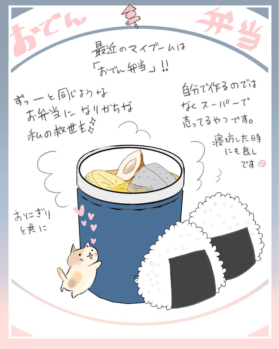おでん弁当 2025年12月05日 ついに東北に本格的な雪のシーズンがやってきましたねー( ´﹀` ٥ ).。Oஇ今日は学校への出勤日。道路に雪は積もっていなかったものの、念のため10分ほど早めに家を出ました。ところが実際に出てみると、道路は大渋滞でほとんど動かず、学校に着く頃には本当にギリギリ。私が出勤日の時は雪降らないで🙏💦 「一枚絵日記」カテゴリの最新記事 タグ :#絵日記 < 前の記事次の記事 > コメント コメントフォーム 名前 コメント 記事の評価 リセット リセット 顔 星 情報を記憶 コメントを投稿する